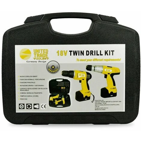 La coppia trapano-avvitatore della United Trade e’ un kit composto da due pistole con batterie da 18v interscambiabili per facilitare e velocizzare i lavori di bricolage e anche professionali. Grazie al peso irrisorio delle due pistole il kit risulta maneggevole grazie al manico ergonomico, facilmete trasportabile grazie alla valigetta in pvc che li custodisce e allo stesso prestante in base a tutte le caratteristiche presenti sul entrambi pistole come la luce LED per una maggiore precisione e visibilità del foro/vite funzione principale, frizione regolabile a secondo della superfice che viene perforata.Rotazione oraria e antioraria. Coppia di regolazione con velocità regolabile. La valigetta e’ composta: 1 avvitatore; 1 trapano; 2 batterie 18v; 4 inserti; 15 punte sia per forare muratura, ferro e legno.