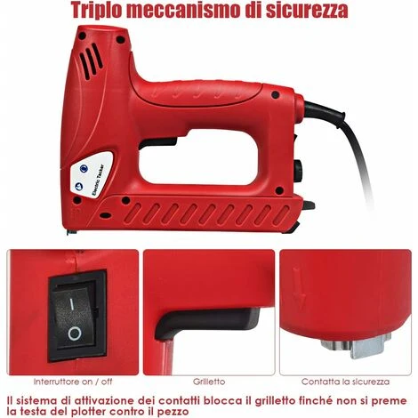Triplo meccanismo di sicurezza: Realizzata con un triplo meccanismo di sicurezza: interruttore on/off, grilletto e sistema di attivazione a contatto, questa pinzatrice elettrica è molto sicura. Il sistema di attivazione a contatto blocca il grilletto quando non premi la testina della pinzatrice verso l’oggetto per evitare incidenti.