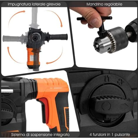 Design con 4 funzioni in 1: La maniglia include le 4 funzioni di trapano, martello pneumatico, scalpello e angoli regolabili e si può scegliere quella adatta in base al lavoro da eseguire. Se prepari una punta del trapano, questo martello pneumatico riesce a forare molto bene anche l’acciaio e il legno.