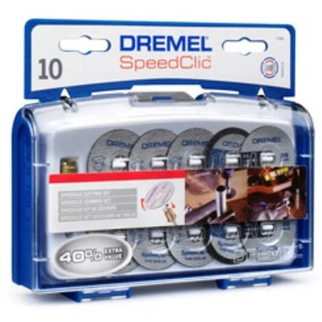Assortimento di dieci dischi taglienti EZ SpeedClicc e lo speciale mandrino per serraggio EZ SpeedClicc. Oltre a quattro dischi per separare il metallo (38 mm), il set contiene tre tagli sottili speciali e tre fette per tagliare la plastica. EZ SpeedClic è il sistema unico a cambio rapido per gli accessori per utensili rotanti. EZ SpeedClic. Montabile veloce, facile, senza attrezzi.