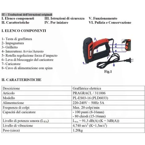 Fornita con: 400 punti metallici h. 14 mm e 100 chiodi h. 15 mm.