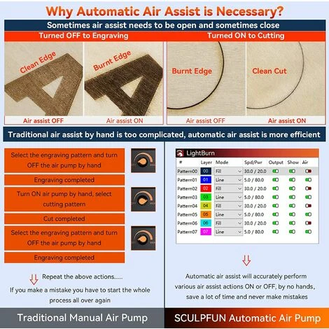 - Sistema di assistenza pneumatica a controllo automatico, che può controllare in modo intelligente l’interruttore di assistenza pneumatica durante l’incisione tramite il pulsante M8 del software Lightburn, rendendo l’incisione e il taglio molto puliti.