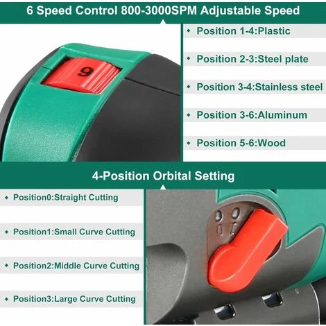 - Una corsa di taglio di 20 mm offre un taglio di alta qualità. 6 velocità regolabili per un facile taglio di materiali diversi.