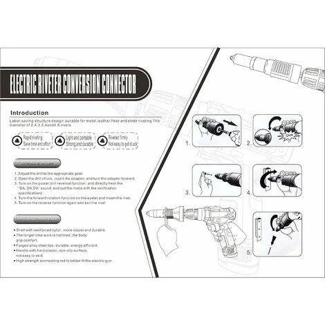 e lavorare. - 【Lista di imballaggio】 1 x adattatore per pistola elettrica per rivetti 1 x manico rimovibile 1 x piccola chiave inglese 1 x tre artigli di ricambio 1 x trapano elicoidale 4 x testa del rivetto (φ 2,4 mm, 3,2 mm, 4,0 mm, 4,8 mm) Linguetta 50 x 4,0 mm. & Nbsp