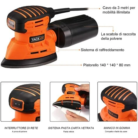 TACKLIFE Levigatrice Mouse Multifunzione, 130W, 12000 RPM, 12 * 140X140X80mm Carte Abrasive Inclusi(6 * 80 Graniglie, 6 * 180 Graniglie), Raccolta Della Polvere, Allacciamento Aspiratore PMS01A