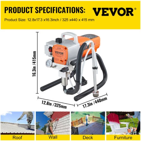 - Spruzzatore di Vernice Airless: lo spruzzatore di vernice è uno spruzzatore facile da usare che applica una finitura liscia senza segni di pennello. Perfetto per dipingere grandi progetti come esterni di casa, recinzioni, ponti, garage, mobili, finiture e altro ancora. Può anche spruzzare varie emulsioni, lattice, smalto, primer, sigillante trasparente e vernice.