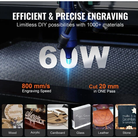 - Incisore Laser CO₂ 60 W: la macchina per incisione laser CO₂ di potenza 60W offre un effetto di stampante preciso ed efficace. Taglia al spessore di 20 mm in una sola passata, si può incidere su legno, acrilico, cartone, vetro, pelle, pietra e altri oltre 1000 materiali a velocità fino a 800 mm/s.