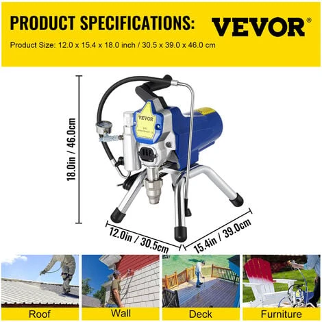 - Spruzzatore di Vernice Airless: lo spruzzatore di vernice è uno spruzzatore facile da usare che applica una finitura liscia senza segni di pennello. Perfetto per dipingere grandi progetti come esterni di casa, recinzioni, ponti, garage, mobili, finiture e altro ancora. Può anche spruzzare varie emulsioni, lattice, smalto, primer, sigillante trasparente e vernice.